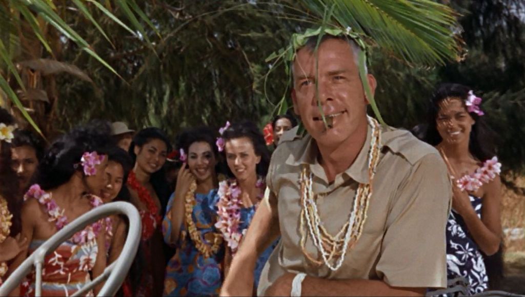 - sobre la cuestión racial. En esta película esa “ambigüedad” – o quizá no sea esta la palabra más adecuada- con la que los no-WASP son tratados en las películas de Ford, (como una distancia respetuosa desde la vigilancia y el dominio) se dispone en algo que, siguiendo el camino de la farsa exótica que es toda la cinta, se columpia entre el ridículo y la solemnidad. Los nativos son tratados con respeto, pero no son más que un decorado cantante, la tristeza de Amelia por constatar el racismo de sus amigos adultos cuando tiene que dejar su casa para que venga su hermana no vuelve a aflorar en toda la película, y queda como un pequeño anticlímax. Los chinos y japonesas son seres monomaníacos, que existen para una sola tarea, y, en fin, el personaje más patético de todos, porque no hace ni gracia, es el nativo secretario del gobernador, que aspira a ser como los blancos. Sin embargo yo no me atrevo a calificar todo esto como racista o como un acto de menosprecio. Bien me abstengo de juzgar las formas de juzgar antiguas. De lo que quiero dejar cuenta es de que, en el fondo, hay que ser un gran creador para poder presentar de forma natural y creíble esta contradicción que nuestro siglo ya no soporta.