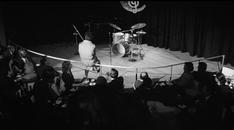 2. Está el público, rodado como se hace en los programas de TV, procurando captar sus reacciones espontáneas. Desconozco si se hizo la película con figurantes aleccionados o público desprevenido. Seguramente haya mezcla de ambos,sus reacciones son naturales, muy realistas, y sin embargo contrastan con ese otro realismo dramático que manifiesta Lenny o las stripers que actúan para ellos. Es otro mundo; el del que está de paso, el del que no está poniendo su vida en lo que hace porque solo desconecta o gasta unas horas nocturnas antes de volver a la rutina gris que quienes están sobre el escenario desconocen. El contraste entre este universo deslavazado, cambiante y arbitrario del público y sus reacciones con la intensidad monolítica de quien está dándolo todo para ellos cinematográficamente se representa con un montaje caótico, a saltos, que a veces nos hace perdernos, en especial en las primeras actuaciones de la peli. No es fácil seguir el raccord en ocasiones, y las distancias y saltos entre los planos generales del recinto o el público completo a primerísimos planos, nos producen un mareo y una saturación que -quizá aquí falta sutileza por parte de Bob Fosse, aunque haya habilidad de gran director- nos “coloca” en el espacio intermedio, muy complejo e indefinible, que ocupamos entre espectáculo y espectadores. Nosotros estamos en esa atmósfera indefinida, ese “ambiente” de la sala que une y vincula al humorista y su público, tan compleja que hay que ser un auténtico maestro, como al parecer era Lenny Bruce, para saber manejar, y no siempre.