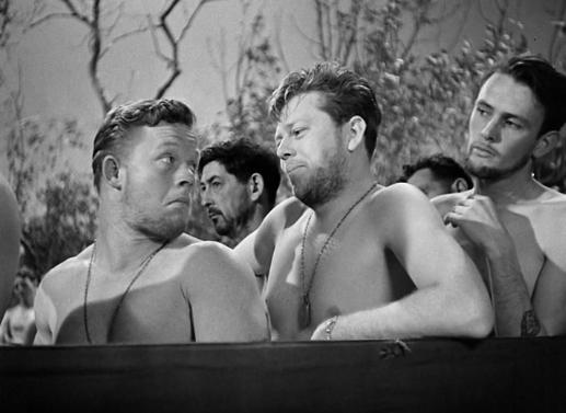 Así que el primer acto de la película, antes de entrar en acción nuestra compañía C, está protagonizado por los rostros. La ambientación militar es nula excepto por los vehículos y un yo diría que fantasioso norte de África demasiado californiano. Pero no importa, porque la atención está en las caras de los soldados, en el perrito que quieren conservar, en unas ilusiones difusas que no tardarán en disolverse. En esta parte se nota mucho la maestría de un director tan visual como Wellman, que sabe componer con mínimos elementos y usar la cámara y la luz para reforzar un discurso que, en su puerilidad, adopta una cierta trascendencia y por supuesto nuestro interés y empatía por esos muchachos que a la vez saben y no quieren saber dónde se meten.