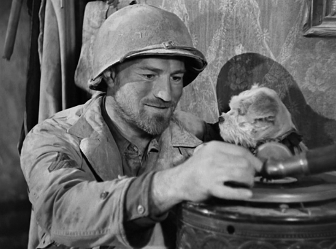 También somos humanos -una de esas “traducciones” al castellano tan acertadas como erradas- nos cuenta la típica historia de una unidad de combate, en este caso la Compañía C del 18º de Infantería, basada en los escritos del conocido corresponsal Ernie Pyle, muerto por cierto meses antes del estreno de la película en el frente del Pacífico. Este punto de vista del reportero empotrado puede detenerse en las historias personales de los soldados, más allá de los avances tácticos y el diario de campaña oficial; así que ya desde el planteamiento se quiere rebajar el tono belicista y violento. La película se rodó y estrenó en las postrimerías de un conflicto que ya tenía a todo el mundo harto de muerte y malas noticias, y es posible que ese tono humanista provenga del deseo de no herir ya más las sensibilidades de un público que puede haber perdido a gente en la guerra y que, posiblemente, no quisiera saber de ella más que su fin, para pasar página y seguir adelante con la vida.