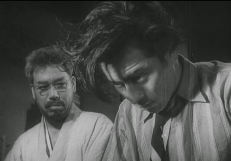 Quizá sea esto último que comento lo que hace que El ángel borracho no termine de ser una obra redonda. En mi opinión el hecho de tener dos personajes protagónicos hace que la atención espiritual o moral que requieren de nosotros, al ser tan fuerte, termina difuminándose de alguna forma. Es al menos lo que yo he sentido. Si quieres que dos protagonistas tengan un desarrollo tan profundo y radical debes tener un guión absolutamente eficaz y completo, y quizá sea esto lo que le falta a este film. Puede que tenga algo que ver el que se fuera reelaborando sobre la marcha para centrarse más en Mifune, lo que por cierto se nota muchísimo. En todo caso es una película tocada con la varita del genio, y se disfruta mucho y no se olvida. Cuenta además con una de las muertes mejor rodadas y concebidas de la historia del cine, imitada por cierto en algunos de sus elementos escenográficos hasta la saciedad.