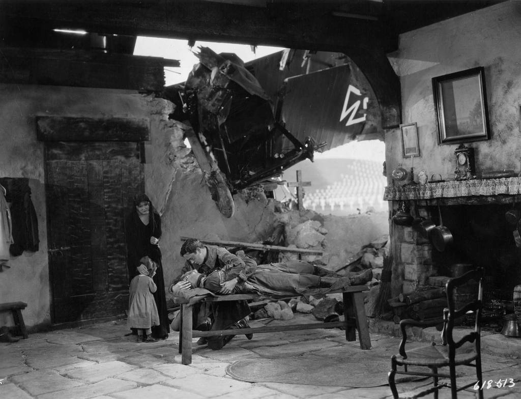 Wings posee una estructura dramática más propia de su tiempo que del nuestro. Está dividida en una serie de cuadros perfectamente separados no solo por los obvios intertítulos e indicativos de tiempo y lugar, sino por estilos diferenciados para cada una de estas partes. Hay un prólogo delicioso en mi opinión, en el que aparte de conocer a los dos amigos protagonistas y a Sylvia (Jobyna Ralston), la chica de la que ambos están enamorados, aunque ella realmente ame a Dave, conocemos a Mary Preston (Clara Bow), vecina y enamorada de Jack, que se queda al cargo de su viejo Ford T al que llaman estrella fugaz, como luego pondrá el joven a su avión de guerra ya en el frente europeo. El siguiente capítulo será el de formación de los pilotos; Jack y Dave llegan enfrentados por su competencia por Sylvia y terminan haciéndose amigos por pelea, esa extraña forma de filiación agonística que solo ocurre en las películas, como otras. La escena más memorable de este episodio es la breve aparición de Gary Cooper, hermoso profeta fatal.