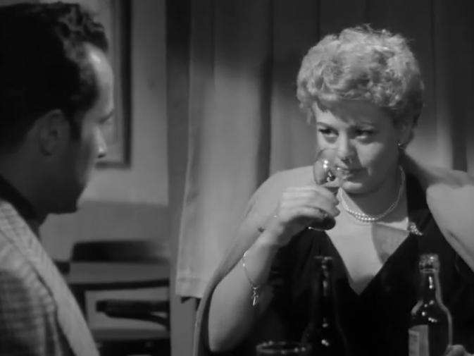 En paralelo a esta trama, que sería la “bonhomía pasiva” de la que hablaba antes, está la otra, la activa, que ejerce en la trama amorosa. Y es que Chu Chu se enamora y se empeña en sacar del charco a Nancy, una pobre desgraciada que es mentirosa compulsiva, alcohólica irredenta y que no tiene ni dónde ir ni especial interés en nada, ni siquiera por Chu Chu. Él sin embargo se encabezona en acompañarla y compartir vida y futuro con ella. Es una trama extraña, como sobrevenida, y es que Shelley Winters lleva a cabo tan buen trabajo interpretándola (y también discutiendo con Wellman, porque ella venía del Actor`s Studio y él venía del Two Takes Enough Studio) que crea una mujer no sé si desagradable, pero sí distante y poco querible. Me recordó su personaje por cierto al que hizo después en Un retazo de Azul, de madre alcohólica e histérica, que es exactamente como si a esta Nancy le hubieran pasado por encima los 13 años que separan ambas películas.