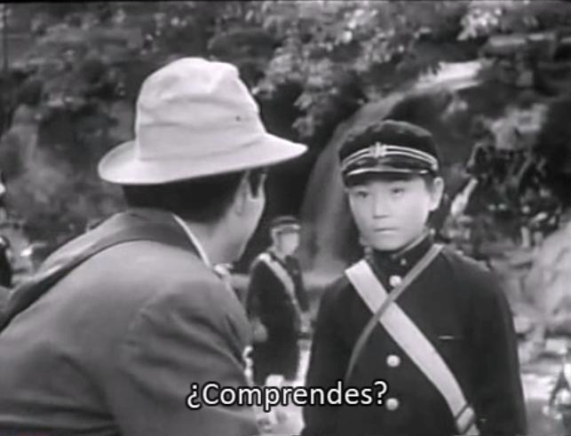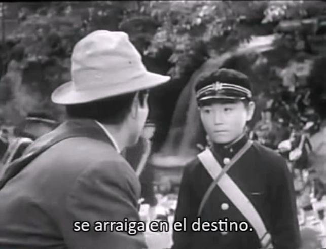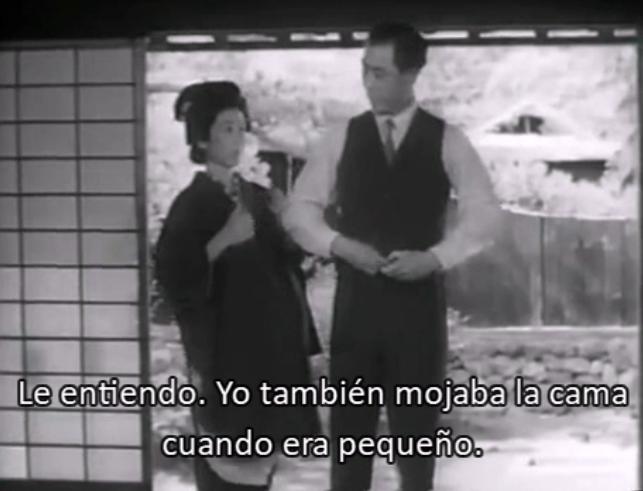 - Lo primero, a modo de curiosidad. Por supuesto que Jiro ¡se mea en la cama!, lugar común de prácticamente todas las películas de Shimizu y otros directores de posguerra. Afortunadamente su abuelo se lo perdona. Se arreglará yendo a un curandero en Kobe especialista en moxibustión. Afortunadamente, como ya dijimos en otro momento, Shimizu ya dio con el remedio definitivo alejado de pseudociencias.