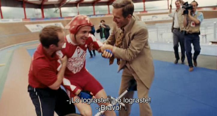 Lo que marcó la diferencia e hizo posible que Obree batiera el récord (dos veces por cierto, en 1993 y en 1995, y esta segunda vez sería Induráin quien se lo levantaría, aunque a su vez apenas le duró unas semanas al grandullón navarro) fue que construyó él mismo una bicicleta muy fea pero muy efectiva, pues le permitía conseguir una posición torturante, incómoda, pero mucho más aerodinámica que la usada habitualmente. Lo que cuenta la película es toda esta aventura de la construcción de la bici y la preparación del récord y, una vez logrado este, la cruzada que la Unión Ciclista Internacional (UCI) emprendió contra Obree y sus inventos. Una de las escenas más curiosas de esta película ingenua hasta lo infantil es la reunión con fondo negro de los gerifaltes de la UCI para discutir este asunto, que recuerda a las tenebrosas reuniones del Partido Republicano de los Simpson.