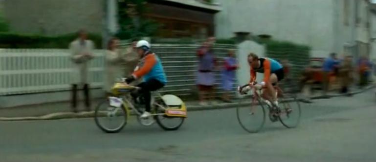 Como es una película muy simpática y entretenida que cualquiera puede disfrutar, -aunque se entiende mucho mejor si se conoce un poco la historia y la dinámica del ciclismo, pero es que eso a su potencial público belga se le supone- no desvelaré más de la trama. Para ser, o por ser,  una comedia muy “clásica”, su protagonista es un personaje casi antipático, amoral, tramposo, violento incluso con los suyos… Pero al final desprende esa ternura de los antihéroes más por lo que le rodea -el ingrato ecosistema del ciclismo profesional- que porque él inspire compasión alguna. De hecho si algo hace especial La bici… es que siendo una farsa de brocha gorda y tratando sobre un tema tan aparentemente inocuo como el deporte, termina siendo muy, muy amarga, no solo por su desesperanzado final, sino porque, justo al contrario de lo que pasaba con A Sunday in Hell, nos viene a decir que más falso aún que los trompazos teatralizados y que los chascarrillos facilones que componen la ficticia historia de Lambert es, fue, o será el ciclismo en sí, deporte de la trampa y del esfuerzo, de la agonía y la simulación. Incluso en esta época mágica de belgas campeonísimos y bicicletas del acero más ligero, vienen a demostrar las hazañas de Ghislain que como ocurre siempre detrás de cada mito hay un cuento, y de cada cuento una mentira, y bajo cada mentira una verdad que nadie quiere escuchar.