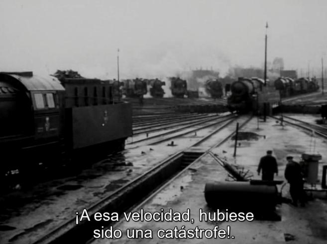 La fotografía de Sangre en los rieles es extraña, demasiado dura y quemada a veces quizá por la calidad del negativo o porque se abusa de la luz natural, no lo sé, pero la planificación de Munk es magnífica, no parece la de un joven que casi está empezando, sino que es la puesta en escena sensata e inteligente de quien ya lleva mucho rodado y sabe en qué debe detenerse y sobre qué no debe explayarse. Los planos cerrados sobre los personajes -sin llegar casi nunca a primeros planos demasiado emocionales- son la elección mayoritaria de Munk, salteada como no puede ser menos por las siempre evocadoras imágenes en movimiento de los trenes y en especial de sus mecanismos, sus piezas móviles, sus luces en la noche y su vapor rabioso. Pero la mejor decisión de Munk en la dirección, me parece, no se ve sino que se oye. No hay banda sonora musical pero, sin embargo, con excepción de breves planos en los que deliberadamente se silencia el fondo para que escuchemos una frase o veamos una imagen importante, durante todo el metraje hay un tapiz sonoro mullido y acuciante de bocinas, vapores, chirridos, golpes, campanas… Son los sonidos de la estación o del tren en marcha o de trenes que pasan o de trenes en la lejanía que no paran ni un segundo. Es un sonido de fondo constante en el que uno puede no fijarse, pues viene con el contexto ferroviario pero que, si caes en la cuenta de que está ahí, lo sientes exagerado, impostado, incesante. Que es un ruido a la vez conveniente e innecesario, hermoso y cargante. Tiene uno al escucharlo un poco la sensación que quizá tuviera el viejo Orzechowski en las asambleas de trabajadores: que se oye lo que más conviene pero no se escucha lo que más importa.