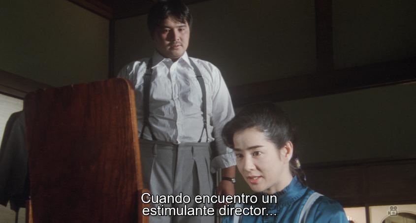 Porque es eso, el contexto, el mundo en el que se hizo mayor Kinuyo Tanaka, es el mismo en el que Ozu desarrolló su genio, y por eso he decidido hacer este apunte, a modo de paréntesis, porque esta olvidada película de 1987 nos deja quizá la única oportunidad de poner, si acaso por unos minutos, imagen a ese cine ilusionado y brutal de los estudios de Shochiku en los años 20 y 30. Ya hemos comentado en textos anteriores de este especial Ozu alguna anécdota sobre el peculiar sistema de producción de los estudios de la ciudad de Kamata en los que se rodaron casi todas las películas de las que hemos hablado hasta ahora. En Shochiku, y supongo que en otras productoras pasaría lo mismo, todo el proceso de producción estaba jerarquizado manu militari. Las decisiones últimas eran siempre de los jefes, como en Hollywood, con la diferencia de que, al ser un sistema más cerrado y especializado, había más confianza en la tarea de los técnicos y creativos. Esto se ve en la película cuando Hiroshi Shimizu -luego hablaremos de él- quiere impedir que Tanaka haga su primer protagonista para Heinosuke Gosho (La bailarina de Izu, de 1933, aunque las fechas no cuadran con la realidad pues Tanaka y Shimizu estuvieron juntos antes de esa fecha) por celos o por lo que sea. Entonces el mandamás de Shochiku se niega en redondo, y sigue el criterio de Gosho, porque es el director especializado en ese género y quiere a Tanaka.