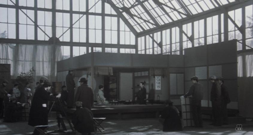 Actriz de cine parece estar dividida en dos partes, como decía antes, y por eso rumio la idea de que fuera concebida como una miniserie de tres capítulos. La segunda cuenta su relación con Mizoguchi, y es muy interesante también pero nada comentaré de ella. La primera es la que nos interesa aquí en el especial kanreki de Ozu, que son sus años en los estudios de Kamata. Como es la única película que yo conozca que los evoca en imagen, esos platós, su ambiente y a sus pobladores, me ha parecido interesante traerla, hacer un pequeño paréntesis en la filmografía de Ozu justo después de El hijo único, que fue, como dijimos, la última cinta que se rodó en ellos, pues no estaban preparados para el sonido. Con el abandono de estas naves acristaladas en las que el calor y el frío eran insoportables, en las que se trabajaba noche y día, de las que apenas salían sus habitantes para adormecer con alcohol la fatiga y alumbrar ideas nuevas, terminó definitivamente este momento único de la historia del cine en el que estos locos orientales se empeñaban en hacer cosas occidentales rodando sin sonido cuando ya en todo el mundo las películas eran habladas.