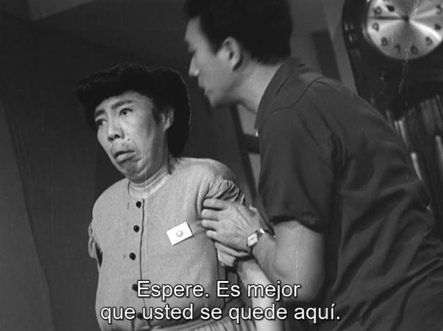 Carmen se enamora no es una gran película, pero pocas he visto que me parezcan tan interesantes por tantos motivos. Por ejemplo, cómo se mezcla el ingenuo pseudoerotismo de las actuaciones de Carmen -graciosísimas, interpretando a la heroína operística mientras su partenaire le va quitando la ropa, pero mejor aún cuando un buen día se niega a desnudarse- con la sátira social más recia y descarada. Y es que Kinoshita se ríe de los tradicionalistas, pero también de las elecciones, del arte moderno, de la izquierda… Incluso se ríe de la bomba atómica. Porque hay un personaje que interpreta Chieko Higashiyama, la entrañable abuela de Cuentos de Tokio, que el mismo año protagonizó la obra maestra de Ozu y aquí hizo este papel muy secundario de criada obsesionada con que la bomba atómica tiene la culpa de todo.