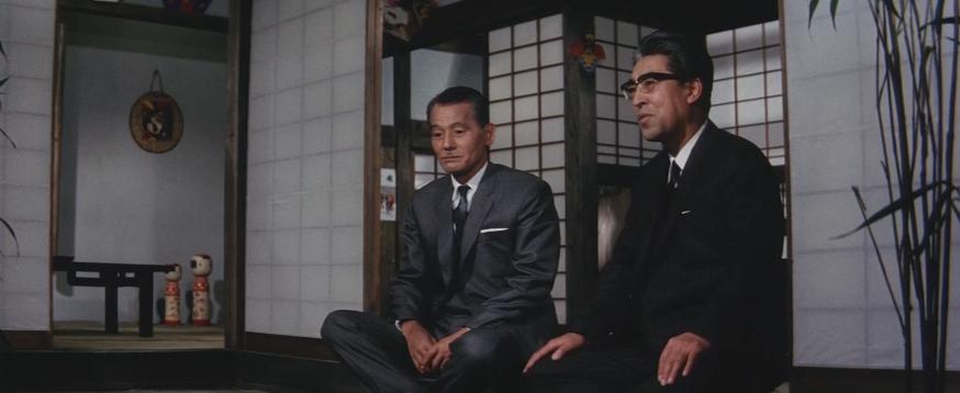 Aparte de estar en formato panorámico -mal aprovechado por cierto- que Ozu no llegó a usar, y a que hace un uso totalmente convencional de recursos fílmicos ajenos al maestro, como movimientos de cámara, fundidos, interpretaciones pasadas de rosca, etc, incluye uno casi ofensivo, que es una voz en off que aclara las acciones de los personajes, en concreto del protagonista, que rellena justo ese hueco narrativo que tantas veces hemos dicho que Ozu dejaba en el primer acto de sus películas, provocando un cierto desconcierto que luego se resolvía por sí mismo. También sale ¡una escena de cama! aunque la mar de comedida y, en fin, es una película que solo busca la carcajada fácil y que, aunque no me he enterado de nada, tengo que reconocer que no parece mala y que posiblemente el japonés medio de 1965 se lo pudo pasar pipa viéndola.