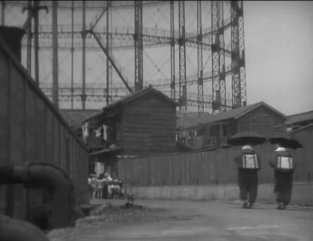 Lo que sí mantiene el maestro de su forma de estructurar las historias es su gusto por las duplicidades, simetrías y llamadas de atención visual. La película está dividida en dos partes claramente diferenciadas, la de la mujer y la de el marido, que a su vez se subdividen en una serie de escenas que tienen su reflejo unas en otras, como las conversaciones de ella con su amiga, o las de él con el suyo, o la visita de ambos al burdel, que detona la conclusión de esa parte, además de un sinfín de planos-almohada e imágenes que se repiten una y otra vez. Destacan sobre todas el -creo que excesivo- recurso de mostrar la escalera a la que se sube al cuarto de la familia en la casa comunal, que simboliza muchas cosas y por la que sabemos enseguida que impepinablemente acabará cayendo Tanaka, o su hábil doble de acción. La otra imagen icónica, en exterior, es ese extraño depósito no sabemos si a medio desmantelar o a medio construir, que gobierna desde sus alturas, en su ruina e inutilidad, a todo el barrio que, lo mismo que él, apenas es el garabato de lo que fue o volverá a ser.