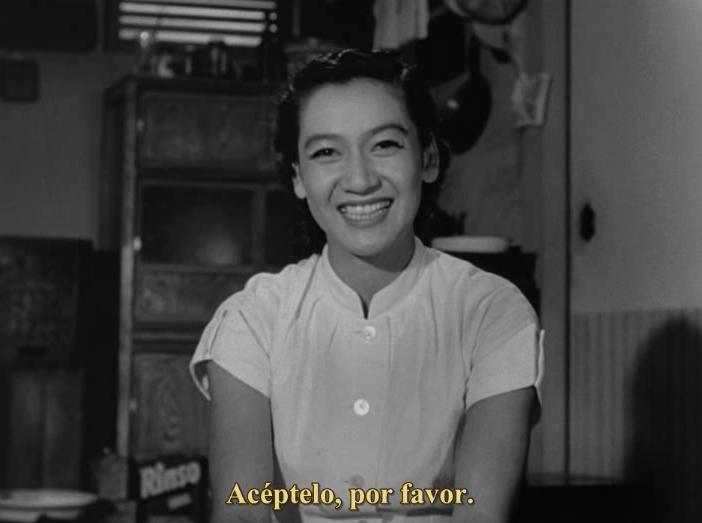 Cuentos de Tokio cierra la llamada trilogía de Noriko y en este caso el personaje, me parece, es muy distinto a los anteriores, aunque lo mismo que en las otras sea una Setsuko Hara casadera. Esta Noriko es, como dice Antonio Santos, una suerte de santa laica. Una mujer que disimula por completo su zozobra personal y que detesta en secreto al hombre desaparecido que era un borracho y parece que la quería poco, pero que aún muerto la obliga a seguir perteneciendo a la familia Hirayama. En ningún momento sabemos de la familia sanguínea de Noriko, si son pobres o ricos, si viven o ella es una superviviente huérfana de referentes. No tenemos ni idea; solo sabemos de Noriko que trabaja en la Bridgestone, que vive en un modestísimo apartamento que carece incluso de cocina propia, que no guarda sake en casa y que hará lo necesario por sus suegros aunque, como confesará a Ryu al final, se siente en el fondo ajena a un marido del que apenas recuerda nada bueno, que querría empezar de nuevo a vivir y que se siente culpable por ello. He aquí un caso extremo de sacrificio silencioso, pues ella misma se martiriza por sus deseos de dejar atrás su vida como Hirayama a pesar de que los mismos padres Hirayama la animan a rehacer su vida con otro matrimonio. Una vez más Setsuko Hara se enfrenta a infinidad de planos, que ella resuelve como nadie más lo ha hecho en la historia del cine, en los que se le exige que la sonrisa más grande camufle la pena más honda. Adiós Noriko, te marchas de la Historia del arte apretando fuerte un reloj pasado de moda de vuelta a la colmena, a la ciudad más grande del mundo que, supongo, alberga aún muchos espacios en los que gente tan maravillosa como tú carga amargada con su vida y sus sonrisas.
