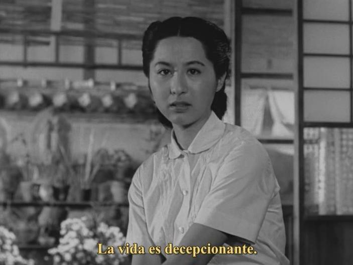Lo dice Kioko (Kioko Kagawa, que por cierto en el día que escribo esto aún vive), la hija menor de los Hirayama, de la que hasta ahora no hemos hablado apenas. Ella se ha quedado en Onomichi con sus padres. Les respeta y les quiere con sinceridad a diferencia de los hijos que emigraron. Es maestra de escuela, y me enternecen los dos o tres planos que nos deja Ozu en los que la vemos salir de casa y saludar a sus pequeños alumnos, que la acompañan. Como es joven y no está maleada por la vida dice lo que piensa con sinceridad. Sus hermanos han asistido a la muerte y funeral de la madre como el que acude a un congreso o una feria de muestras, con el tiempo justo y llevándose después atractivos souvenirs, en este caso efectos personales de la muerta. Solo Noriko se ha quedado unos días para acompañar al padre y a ella misma, y a Noriko le dice esto, que la vida es decepcionante.