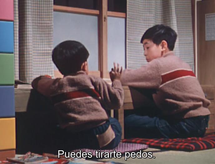 Suelo recomendar Buenos días como una buena puerta de entrada al cine de Yasujiro Ozu. Quizá lo hago, además de por su calidad -digamos que está entre las mejores de las que no son las mejores de su filmografía- porque es tan simpática y ligera que me parece imposible aburrirse con ella. Sin embargo, mientras más veces la veo más pienso que es a la vez muy de Ozu pero muy anómala, extraña, en el contexto de su obra. Es como una de sus primeras películas mudas de pilluelos y estudiantes pasada por el tamiz de la modernidad y el color. Es rara en su cine de posguerra, la única comedia pura que no incluye entre sus historias asuntos matrimoniales ni drama personal alguno. Bueno sí, el pobre chaval que cada vez que intenta ventosear se caga encima vive un drama más traumatizante que el de de alguna pseudonoriko que yo me sé, pero digamos que su caso no forma parte de la trama principal.