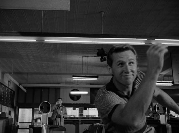 Intercaladas con la trama delictiva se han ido presentando otros personajes que en la segunda parte del film lo conducirán hacia su verdadera razón de ser, que es la denuncia social. En brutal oposición a la vida pobretona y la desesperación de Howard, conocemos a Gil Stanton (Richard Carlson), un periodista local de pluma relamida al que invitan a hacerse cargo de esta “ola de crímenes” y que él, por pura autocomplacencia, convierte en una serie de artículos sensacionalistas que se recrean en los más bajos instintos para especular sobre unos criminales de los que realmente aún no se sabe nada. También, y este es un momento curioso, Enfield se detiene en la fascinación que la televisión ejercía ya entonces sobre la clase media, por eso Howard promete a su mujer y a su hijo que en cuanto ahorre algo tirarán la vieja radio y la cambiarán por la tele, y por eso cuando vuelve a altas horas de la noche de un atraco y encuentra una nota pegada a la puerta de casa, que por la inexpresividad de Lovejoy nos pareciera una nota de despedida, descubrimos que no, que están en casa de un vecino viendo la tele, en cuyo salón ellos y más gente del barrio miran embobados la caja tonta. Enfield hace un travelling lateral muy significativo que deja claro su desdén por un medio que, como el periódico sensacionalista del pueblo, emboba al público. Como respuesta crítica a esta situación aparece un personaje curioso, un científico italiano que no sabemos qué pinta en el pueblo, pero que se aloja con el periodista y que, preocupado por su deriva sensacionalista, le recuerda que es la razón y no la emoción lo que deberíamos usar para explicar las cosas, incluso la cruel naturaleza de unos asesinos despiadados como parecen ser Jerry y Howard.