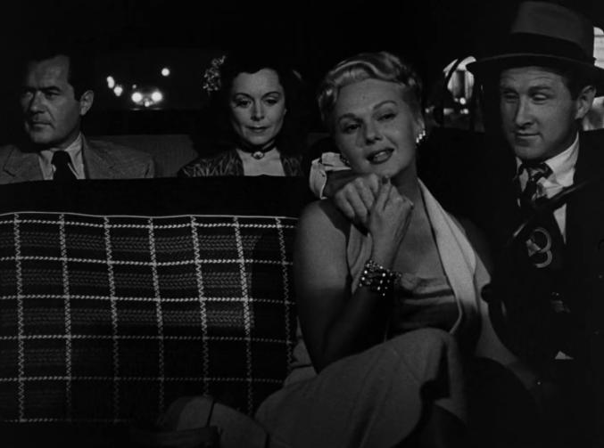 La segunda parte del film comienza cuando, obligado a alternar con Jerry, el único asesino despiadado de los dos, Howard, se da a la botella roído por la culpa y por el miedo de enfrentar la realidad en casa, y suda mucho mientras una amiga de la amiguita de Jerry intenta ligar con él. El personaje de esta chica debo reconocer que me ha fascinado porque es ella misma un resumen completo del cine negro de serie B. Se trata de una solterona desesperada por encontrar a alguien que la quiera, así que cuando aparece Howard, aunque ni es guapo ni apenas le dirige la palabra ni hace otra cosa que sudar y beber wiskis dobles, se enamora hasta las trancas. La actriz que la interpreta, que se llamaba Katherine Locke pero nació con otro nombre supongo en lo que hoy es Bielorrusia, es una intérprete mala tirando a pésima, pero es precisamente su forzada expresividad mal modulada, y su rostro atractivo pero poco fotogénico lo que realmente la hacen creíble, o mejor dicho, parte misma de ese contrato por hora y media con la incredulidad que supone el visionado de estas películas. Su malestar en la pantalla acompaña de forma que parece natural y fluida el malestar mal interpretado por Lovejoy, que llora y se desespera tan torpemente que solo una intérprete torpe que anima un personaje torpe puede secundarlo.