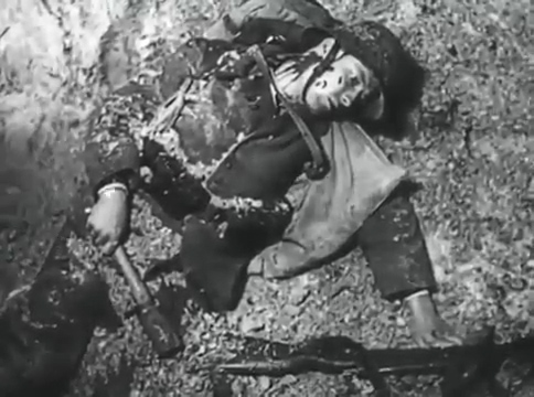 La película está claramente dividida. Por un lado las típicas escenas de preparación del combate en la trinchera y de “camaradería” en los refugios subterráneos, con algunos soldados y algún oficial que comentan lo que va sucediendo en el día a día o las noticias que llegan de casa o del enemigo. Estas escenas tienen nulo interés cinematográfico. Los actores, acartonados, recitan frases sin gracia ninguna. Es complicado incluso, desde nuestro punto de vista actual de espectadores extranjeros y alejados en el tiempo, distinguirlos entre sí. Alguno tiene bigote, uno que es bávaro lleva siempre una pipa colgando… Poco más. Por otro lado está claro que no se ha puesto interés en dotarles de una mínima identidad personal. Sabemos que son alemanes y eso les gusta mucho, pero ni son especialmente amigos del combate ni sus proclamas son de odio al enemigo. En este sentido, como decía antes, la película es incluso mesurada. Son soldados correctos, que hacen lo correcto, con el normal miedo a morir, muy valientes eso sí para presentarse voluntarios y, en fin, poco más hay que decir. No tienen recorrido vital alguno y espiritual, pues lo justito; cantan himnos cuando toca y ya. Por supuesto claro está que son mejores soldados que los inútiles franceses -esto sí es gracioso, cómo se entregan en masa sin combatir- y se les ve más dignos que a esos ridículos escoceses que mueren en faldita, y cuyos cadáveres están a punto de mostrarnos el lamentable espectáculo de sus partes pudendas… en fin, es una producción “películas arias”. Todo esto es una mínima parte de la película, las escenas de interior deben representar como mucho el 30% del metraje. Lo interesante es lo otro.