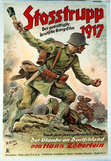 No es fácil encontrar información sobre esta película que, sin embargo, fue un enorme éxito cuando se estrenó en la Alemania de 1934, en plena euforia por la llegada de Hitler al poder. Auspiciada por el partido nacionalsocialista, y bajo el amparo de la productora de indisimulado nombre “películas arias» se basa en las memorias de trinchera del director, Hans Zöberlein, tituladas “La fe en Alemania”lo que también da pistas de por dónde van los tiros, nunca mejor dicho. Tropas de asalto es, pues, un artefacto propagandístico que triunfó en su momento, como decíamos, porque conjugó la tremenda espectacularidad de sus escenas bélicas con el rampante nacionalismo belicista que se adueñara de la sociedad alemana durante el desgraciado gobierno de Hitler.